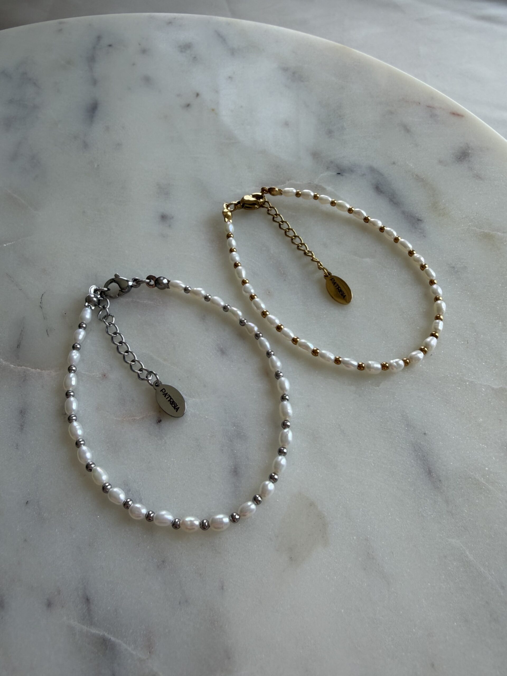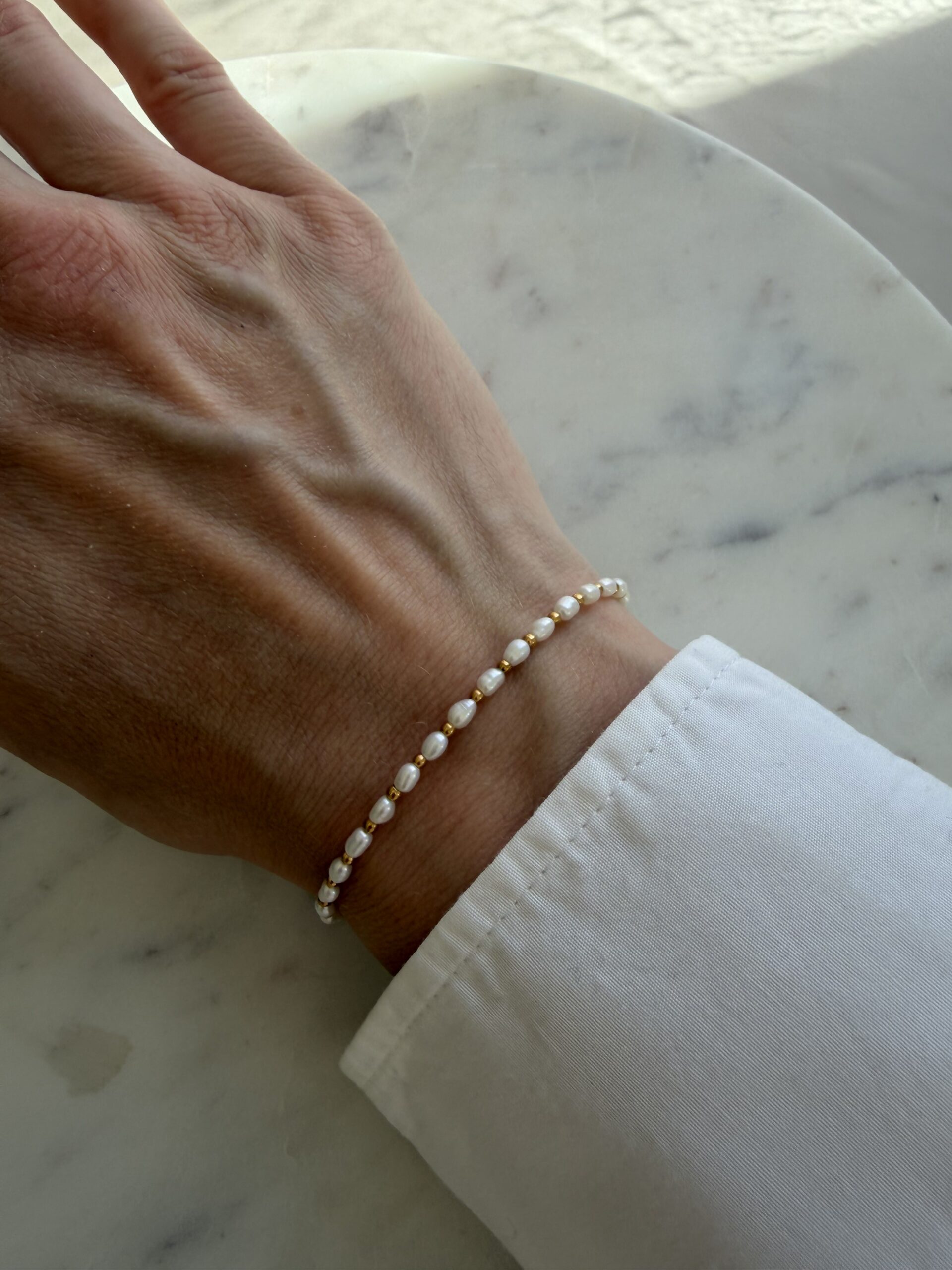 Náramok MINIMALIST je vyrobený z jemných riečnych perličiek a korálok z chirurgickej ocele.